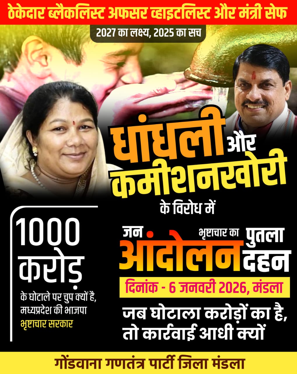 रेवाँचल टाईम्स – मंडला, सुनलो भृष्टाचारियों गोंगपा की…सत्ता सिस्टम पर सीधी नज़र है जिस तरह पानी जैसी बुनियादी जरूरत की योजना में घोटाले सामने आ रहे हों, तो केवल आंकड़े गिनाना पर्याप्त नहीं जवाबदेही तय किए बिना “हर घर जल” का दावा खोखला है। जल जीवन मिशन में करोड़ों रुपये के घोटाले पर राज्यमंत्री संपतिया उइके के बयान जनता की आंखों में धूल झोंक रहा है जल जीवन मिशन घोटाले में आरोपी बनाकर हटाये नहीं, सिर्फ बचाए गए है, जब घोटाला करोड़ों का है, तो कार्रवाई आधी क्यों? मंत्री बता रही है कि जिन ठेकेदारों ने गड़बड़ी की है, उन्हें बड़ी संख्या में ब्लैकलिस्ट किया गया है तो ठेकेदार किसके संरक्षण में घोटाला किये, क्या कमीशन के भ्रष्टाचार की जड़ तक पहुंचने से बचा जा रहा है? मंत्री के सरकारी दावे में प्रदेश में 13.69 लाख क्रियाशील नल कनेक्शन 10,440 गांवों में हर घर जल 64 गांवों में 24 घंटे जल आपूर्ति का पायलट प्रोजेक्ट 15,238 नए नलकूप व हैंडपंप है जबकि जमीनी हकीकत जीरो है आज भी गांवो में पाईप गड़े है लेकिन कनेक्शन नहीं, नल लगे है पर पानी नहीं, गांव सूखे है, मंडला जिले भर में ही नल जल जीवन मिशन का पानी सिर्फ कागजो में बह रहा है, और घोटाले की मंत्री के बंगला तक छलक रहा है | करोड़ों के घोटाले में आरोपी अफसर को हटाना नहीं, सिर्फ एडजस्ट करना भ्रष्टाचार को संरक्षण देना है और मध्यप्रदेश की मोहन सरकार यही भृष्टाचारियो, कमीशन खोरो को संरक्षण कर रही है | इसलिये गोंडवाना गणतंत्र पार्टी ने यह धाँधली के राजनीतिक संरक्षण के विरोध में 6 जनवरी 2026 को मंत्री के जिला मुख्यालय में जन आंदोलन का आगाज किया है, भृष्टाचारियो का पुतला दहन कर जनता की आवाज सड़क से सत्ता तक पहुंचायेगा | जब गांव सूखे पड़े हों और फाइलों में पानी बह रहा हो, तब चुप रहना सबसे बड़ा अपराध है। यह लड़ाई पानी की है, हक़ की है और सम्मान की है।