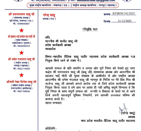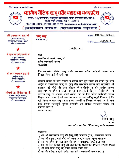 दैनिक रेवांचल टाइम्स – भोपाल भारतीय तैलिक साहू राठौर महासभा के संस्थापक अध्यक्ष पूर्व राजयसभा सदस्य रामनारायण साहू के आदेशानुसार, मुख्य सरंक्षक माननीय प्रधानमंत्री जी के भाई प्रहलाद मोदी के निर्देशानुसार राष्ट्रीय अध्यक्ष उमेशनन्दलाल जी एवं प्रदेश अध्यक्ष नरेंद्र साहू ने सत्येंद्र साहू को भारतीय तैलिक साहू राठौर महासभा का प्रदेश कार्यकारी अध्यक्ष मनोनीत किया.भारतीय तैलिक साहू राठौर महासभा मे सत्येंद्र साहू को कार्यकारी अध्यक्ष बनाए जाने पर बधाई एवं शुभकामनाएं समाज के वरिष्ठ जनो ने प्रेषित की.