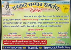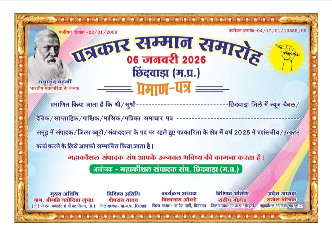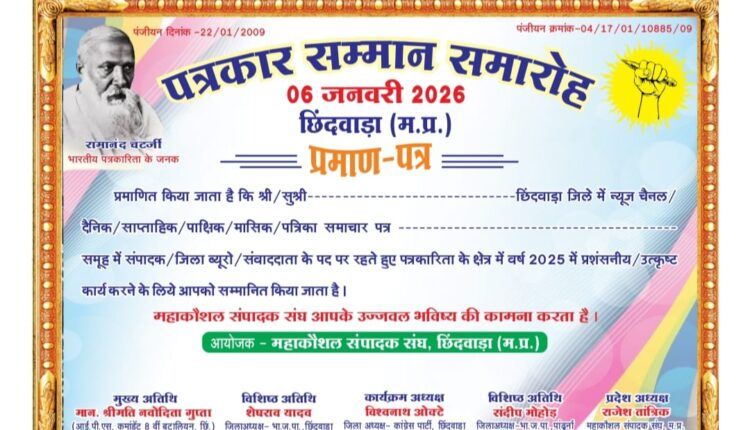 रेवांचल टाइम्सछिंदवाड़ा|पत्रकारिता के क्षेत्र में उत्कृष्ट कार्य करने वाले कलमकारों के सम्मान में आज छिंदवाड़ा की धरती पर एक भव्य आयोजन होने जा रहा है। महाकौशल संपादक संघ मध्य प्रदेश द्वारा आज 6 जनवरी, मंगलवार को छिंदवाड़ा एवं नवगठित पांढुर्णा जिले के पत्रकारों के लिए “पत्रकार सम्मान समारोह” का आयोजन किया गया है।