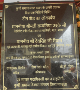 पटेल मंगल भवन के टीन शेड का लोकार्पण कार्यक्रम संपन्न, कुर्मी समाज एक संगठित समाज– संपत्तिया उइके