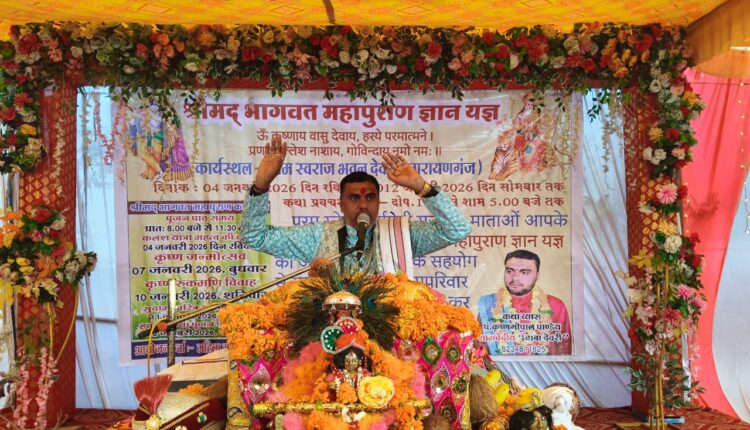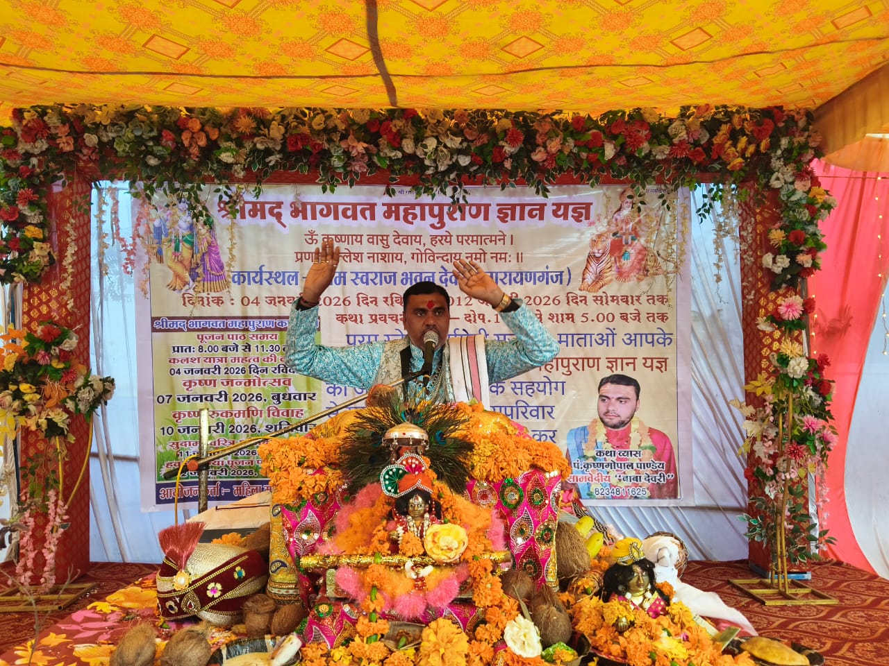कथा व्यास पंडित कृष्णगोपाल पाण्डेय ने अपनी ओजस्वी और अमृतमयी वाणी से प्रभु श्रीकृष्ण जी के जीवन प्रसंगों का सजीव वर्णन किया। नौ दिनों तक चली इस ज्ञान गंगा में उन्होंने भगवान के बाल्यकाल, माखन चोरी, गोवर्धन लीला और रुक्मणी विवाह जैसे प्रसंगों को विस्तार से सुनाकर श्रोताओं को मंत्रमुग्ध कर दिया। समापन दिवस पर कथा व्यास पंडित कृष्णगोपाल पाण्डेय ने भागवत महापुराण के सार को समझाते हुए भक्ति के महत्व पर प्रकाश डाला।