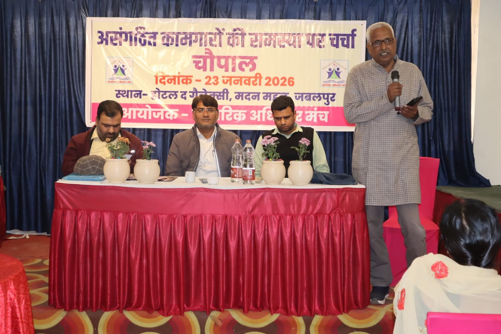 दैनिक रेवांचल टाईम्स – जबलपुर- कल 23 जनवरी को नागरिक अधिकार मंच के तत्वाधान में मदन महल स्थित सभागार में “मजदूर चौपाल” का आयोजन किया गया। नागरिक अधिकार मंच के शिव कुमार चौधरी ने कार्यक्रम के उद्देश्य को रखते हुए कहा कि भारत सरकार और मध्य प्रदेश सरकार के द्वारा असंगठित क्ष्रेत्र के कामगारों की सामाजिक सुरक्षा के लिए चलाई जा रही योजनाओं की जानकारी देना और इन योजनाओ के लाभ लेने में आ रही समस्याओं का निराकरण करना है। इस कार्यक्रम में बगिया टोला रांझी, सुभाष नगर अधारताल, चेरीताल दमोहनाका, क्रेसर बस्ती बरगी हिल्स, बागड़ा दफाई, पोली पाथर और दुर्गानगर ग्वारीघाट के मजदूर और महिलाएं उपस्थित रही।इस कार्यक्रम में अतिथि के रूप में भारत सरकार के केन्द्रीय श्रम विभाग से धर्मवीर मौर्या, शैलेन्द्र जैन और एसीस्टेंट लेबर कमिश्नर कार्यलय जबलपुर की ओर से श्रम निरीक्षक आशुतोष शर्मा उपस्थित रहे। धर्मवीर मौर्या ने चौपाल में मजदूरों को भारत सरकार द्वारा असंगठित क्षेत्र के कामगारों के लिए लाई गई “प्रधानमंत्री श्रमयोगी मानधन योजना” के बारे में विस्तृत जानकारी दी गई, जिसमें बताया गया कि इस पेंशन योजना में यदि मजदूर प्रति माह 200 रुपए जमा करता तो इसमें सरकार भी अपना अंशदान 200 रुपए मिलाती है, और मजदूर की उम्र 60 वर्ष होने के उपरांत मजदूर को प्रतिमाह जब तक मजदूर जीवित रहेगा उसे 3000 रुपये प्रदान किया जावेगा, समय के साथ यह राशि बढ़ेगी | आशुतोष शर्मा ने मजदूरों से चर्चा करते हुए कहा कि सभागार में उपस्थित सभी मजदूर भाई बहनों से अनुरोध है कि सबसे पहले आप सभी लोग अपने -अपने दस्तावेजों का के.वाय.सी. करा लें। यदि यह नहीं है तो आपको किसी भी योजना का लाभ नहीं मिलेगा। उन्होंने भवन एवं अन्य निर्माण मंडल के अन्तर्गत योजनाओं की जानकारी प्रदान की। जिसमें विशेष रूप से श्रमोदय विद्यालय में दाखिला की प्रकिया और छात्रों को मिलने वाले लाभ पर विस्तृत जानकारी प्रदान दी गई , जहां पर बच्चो को निःशुल्क आवासीय सी.बी.एस.ई. आधारित शिक्षा प्रदान की जाती है। चौपाल के अंतिम सत्र में मजदूरों ने अपनी समस्यायों को अधिकारियों के समक्ष रखा। कार्यक्रम में उपस्थित अधिकारियों ने मजदूरों की जिज्ञासाओं को हल करने का प्रयास किया। इस कार्यक्रम में उपस्थित सामाजिक कार्यकर्त्ता राजकुमार सिन्हा ने मजदूर से संवाद करते हुए कहा कि आप सभी असंगठित कामगारों को अपना एक सक्रीय संगठन बनाना चाहिए, जो मजदूरों का प्रतिनिधित्व करे और आपकी बातों को सरकार के समक्ष रखे। इस कार्यक्रम में रमा डोंगरे, ममता साखरे, रूपा कोल, सविता सोनवाने, छोटी बाई चौधरी, रीता चौधरी, पूजा मूर्ख, एंजलिना सोलोमन, कौशल कबीर, गायत्री साहू, विकास खोबरागड़े,शूभम चौधरी, अभिषेक चौधरी आदि 