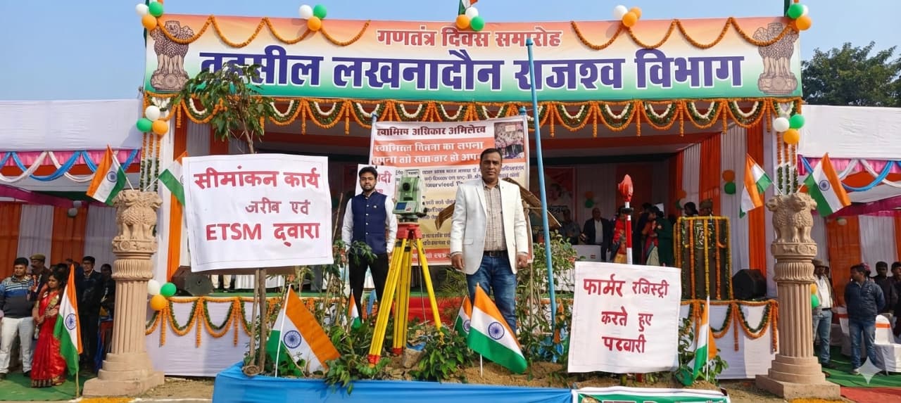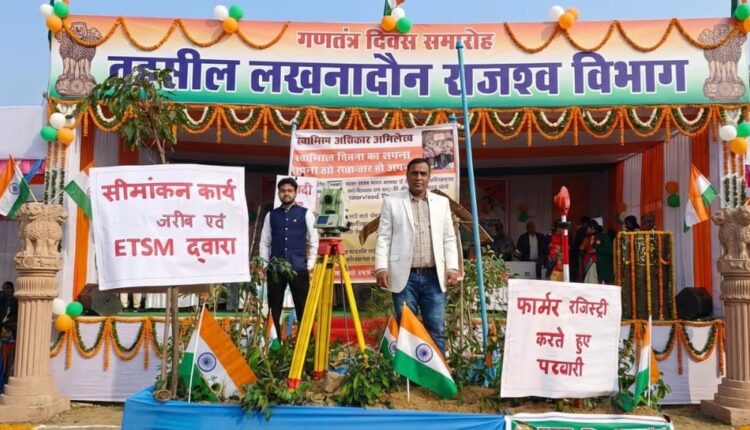 पहली झांकी में खेतनुमा आकृति बना कर उसका ETSM MACHINE के द्वारा सीमांकन कार्य करते हुए एवं फॉर्मर रजिस्ट्री बनाते हुए पटवारी प्रदर्शित किया गया।