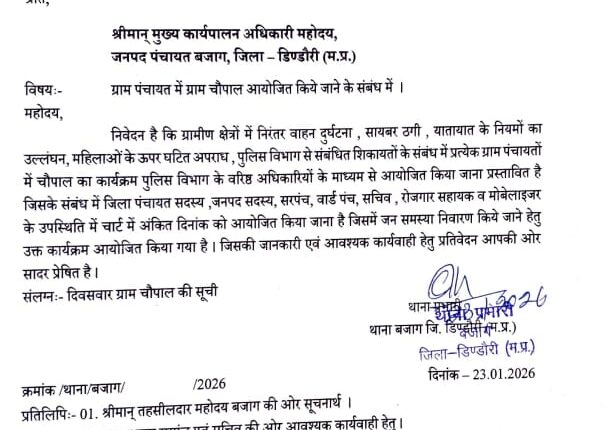 वही थाना प्रभारी शिवलाल मरकाम द्वारा जनपद पंचायत के मुख्य कार्यपालन अधिकारी को इस संबंध में पत्र भेजकर जानकारी दी गई है। पत्र में उल्लेख है कि ग्राम चौपाल के माध्यम से आमजन को कानून संबंधी जानकारी दी जाएगी तथा उनकी समस्याओं, शिकायतों एवं सुझावों को सीधे सुना जाएगा। कार्यक्रम में जिला पंचायत सदस्य, जनपद सदस्य, सरपंच, वार्ड पंच, सचिव, रोजगार सहायक, मोबिलाइजर सहित ग्रामीणजन उपस्थित रहेंगे। इस संबंध में प्राप्त जानकारी के अनुसार
