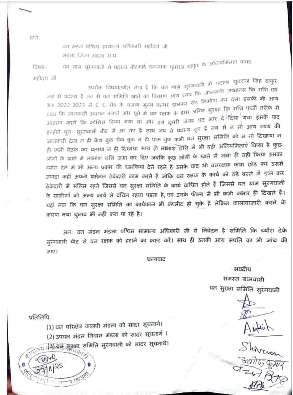 रेवांचल टाइम्स मंडला आदिवासी बहुल जिला मंडला, जो वर्षों से अपनी बहुमूल्य वन संपदा और आदिवासी संस्कृति के लिए जाना जाता है, आज वन विभाग की कथित लापरवाही और भ्रष्टाचार का शिकार बनता जा रहा है। मंडला पश्चिम वन मंडल अंतर्गत सुरंगवानी वन ग्राम में पदस्थ बीट गार्ड युवराज सिंह ठाकुर पर वित्तीय अनियमितताओं शासकीय योजनाओं में घोटाले और ग्रामीणों को धमकाने जैसे आरोप लगे हैं। आक्रोशित ग्रामवासियों ने एक स्वर में उन्हें तत्काल हटाने और उनकी आय–संपत्ति की उच्चस्तरीय जांच की मांग की है।