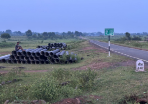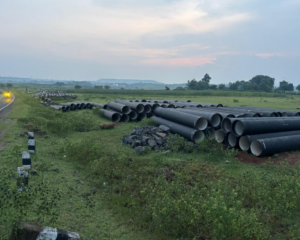 सड़क किनारे महीनों से पाइपों के बंडल पड़े हैं