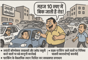शहर के मध्य स्थित जयंती कॉम्प्लेक्स के सामने सड़क पर अव्यवस्थित और अवैध पार्किंग की समस्या वर्षों से बनी हुई है। यह समस्या अब महज जाम और दुर्घटनाओं का कारण नहीं रह गई, बल्कि खुलेआम कानून की धज्जियां उड़ाई जा रही हैं। सबसे गंभीर बात यह है कि कॉम्प्लेक्स के संचालक और उनके एजेंट सड़क पर पार्किंग करवाकर उससे ₹10 रुपए की पर्ची काटकर सीना ठोंककर अवैध वसूली कर रहे हैं।