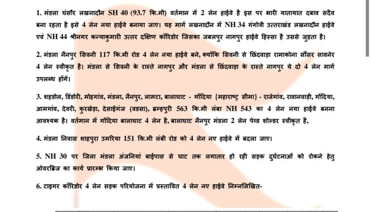 बैठक में रेल के साथ-साथ सड़क विकास पर भी चर्चा हुई। इसमें मंडला–घंसौर–लखनादौन मार्ग को 4 लेन हाईवे बनाने, मंडला–नैनपुर–सिवनी मार्ग का चौड़ीकरण, तथा NH-543 सहित कई प्रमुख सड़कों को 4 लेन में परिवर्तित करने की मांग की गई।