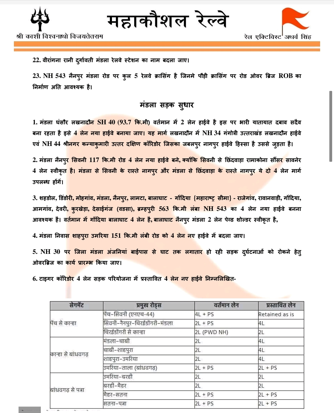 अथर्व सिंह ने मंडला क्षेत्र के लिए कई नई ब्रॉडगेज रेल परियोजनाओं को भी आवश्यक बताया। इनमें प्रमुख रूप से