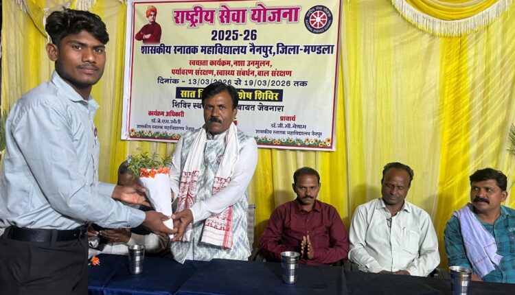 दैनिक रेवाँचल टाईम्स – मंडला, जिले के नैनपुर शासकीय स्नातक महाविद्यालय नैनपुर के एन एस एस इकाई के द्वारा ग्राम जेवनारा में सात दिवसीय विशेष शिविर का आयोजन किया गया। एन एस एस वॉलिंटियर के द्वारा प्रभात फेरी निकालकर लोगों से बेहतर स्वास्थ्य हेतु प्रातः काल समय पर उठकर योग और व्यायाम के लिए प्रेरित किया इसके पश्चात परियोजना कार्य के तहत विभिन्न जल स्रोतों सार्वजनिक स्थल एवं शैक्षणिक संस्थाओं की साफ सफाई कर लोगों को जागरूक करने का प्रयास किया अंतिम दिवस कार्यक्रम का समापन मां सरस्वती के एवं स्वामी विवेकानंद जी छायाचित्र में तिलक बंधन माल्यार्पण एवं दीप प्रचलित कर कार्यक्रम को शुभारंभ किया गया