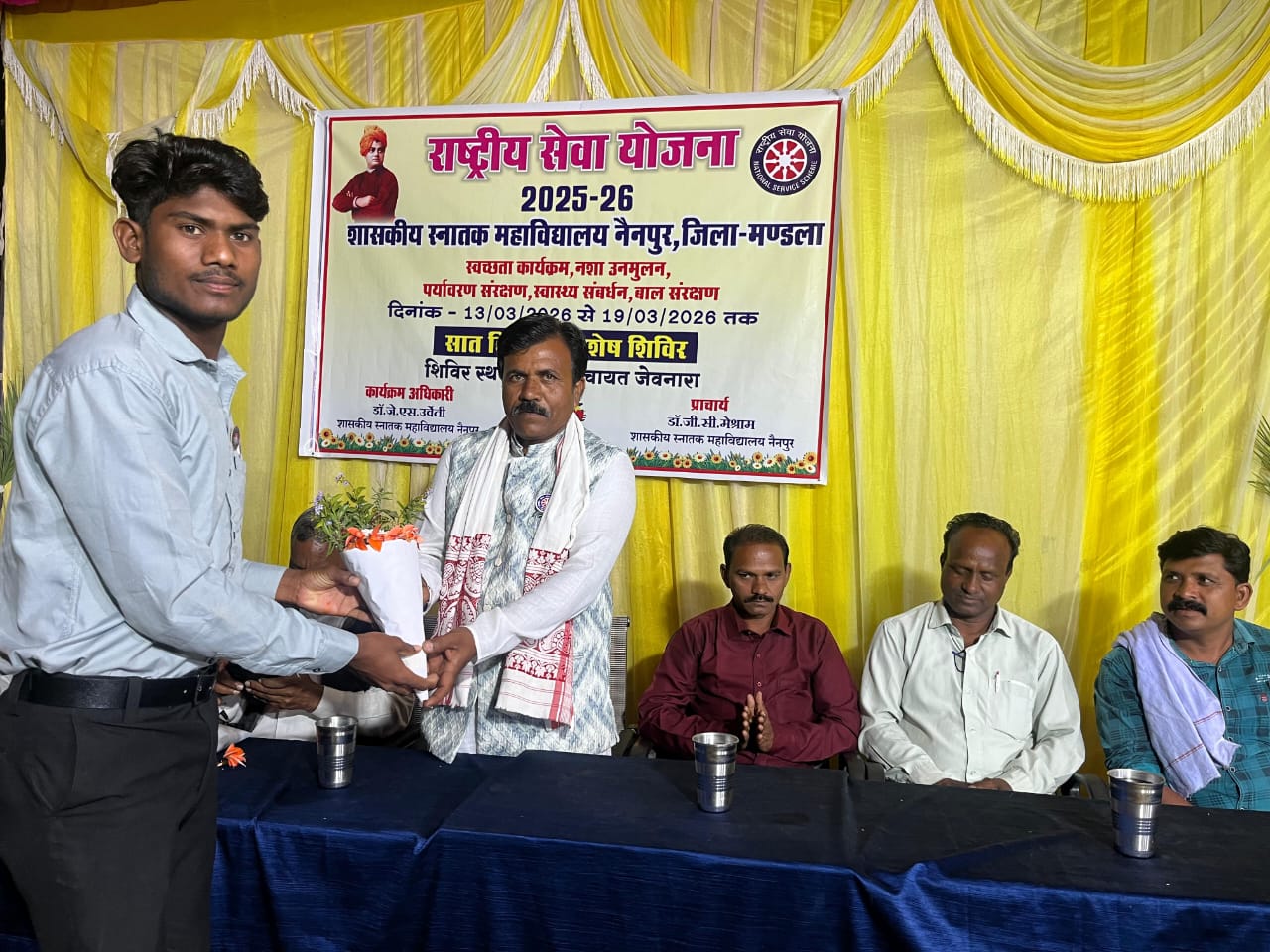 कार्यक्रम अधिकारी डॉ .जे.एस उवे॔ती के द्वारा सात दिवस का पालन प्रतिवेदन का वाचन किया गया कार्यक्रम में विभिन्न सांस्कृतिक कार्यक्रमों के साथ कार्यक्रम को बृहद एवं सुंदर बनाने का प्रयास किया गया कार्यक्रम में मुख्य अतिथि सरपंच बृजमोहन उईके, उपसरपंच सुरेंद्र पटेल, जन भागीदारी अध्यक्ष दामोदर झरिया सदस्य दिनेश पटेल अजय नगरिया अरविंद मरावी समाजसेवी जाहिद खान एवं ग्राम के गणमान्य नागरिक उपस्थित रहे महाविद्यालय परिवार से कार्यक्रम के अध्यक्षता कर रहे हैं प्राचार्य डॉक्टर जी सी मेश्राम, डॉक्टर ज्योति सिंह, कैप्टन डॉ. राजेश मासतकर डॉ. कुलभूषण रजक, डॉ. प्रियंका चक्रवर्ती, प्रो.रविंद्र चौहान प्रो. देव प्रकाश के गिरधर सिंह राजपूत डॉक्टर संजीव सिंह अमित यादव की उपस्थित रहे।