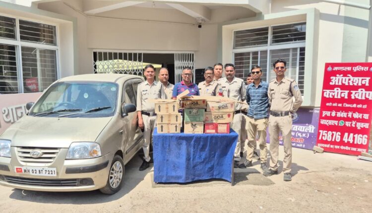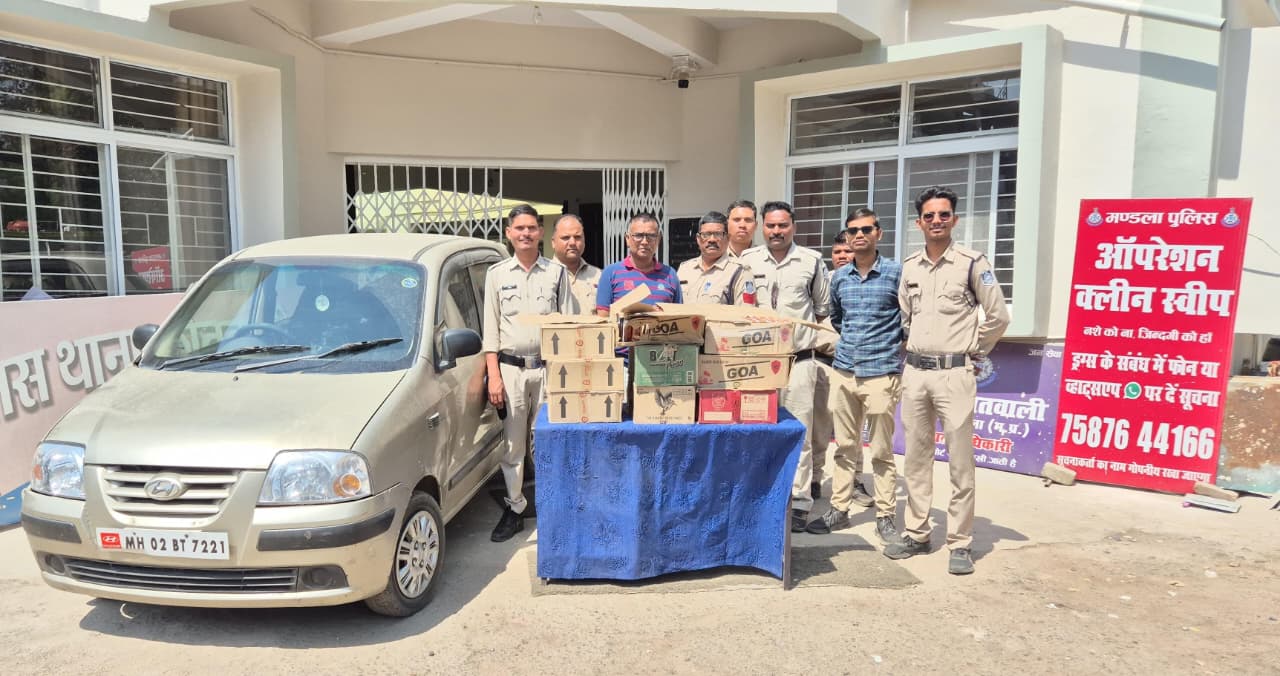 कार्रवाई के दौरान संदिग्ध सेंट्रो कार क्रमांक MH02 BT 7221 को रोककर तलाशी ली गई, जिसमें देशी एवं अंग्रेजी शराब की 9 पेटियां बरामद हुईं।