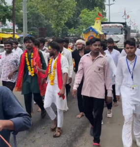 बाजे की गूंजती धुन पर, “बोल बम” और “हर हर महादेव” के जयकारों से पूरा वातावरण गुंजायमान हो उठा। कांवर अपने कंधों पर उठाए, भगवा वस्त्रों में सजे ये युवा भक्त पूरे जोश के साथ कदम से कदम मिलाते हुए नगर की ओर बढ़े। रास्ते भर भक्तों का उत्साह देखने लायक था, जहां स्थानीय लोगों ने भी उनका अभिनंदन किया।