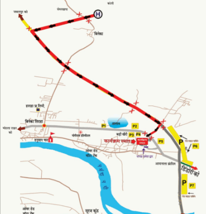 नोट:- वीआईपी आगमन/ प्रस्थान व कार्यक्रम के दौरान वीआईपी मार्ग तथा कार्यक्रम स्थल की ओर समस्त प्रकार के भारी वाहनों का प्रवेश निषेध रहेगा।