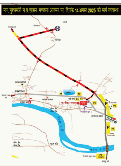 मुख्यमंत्री मध्य प्रदेश शासन का 14 अगस्त 2025 को जिला मंडला आगमन के दौरान पार्किंग एवं मार्ग व्यवस्था जारी हुआ रूट चाट