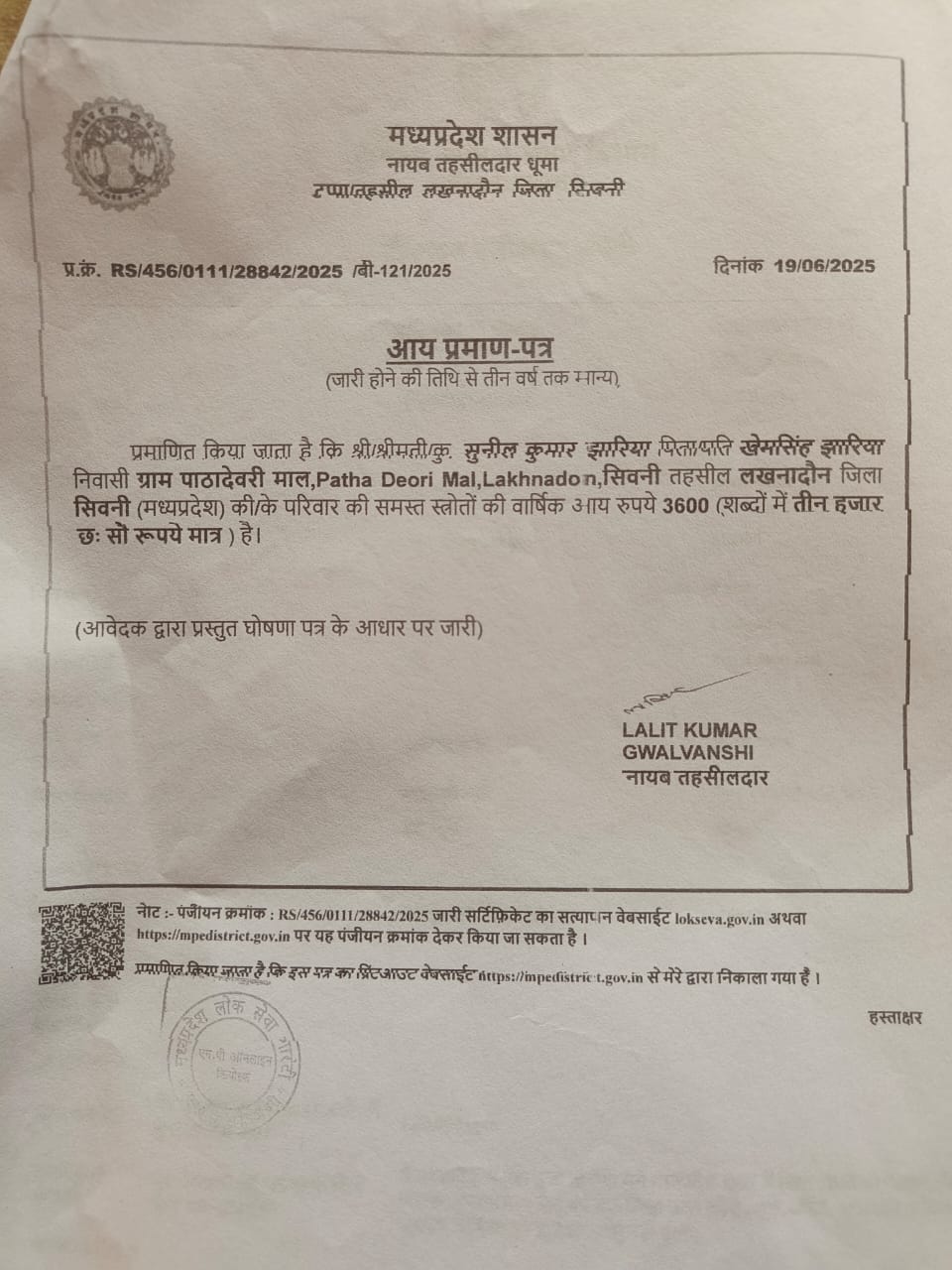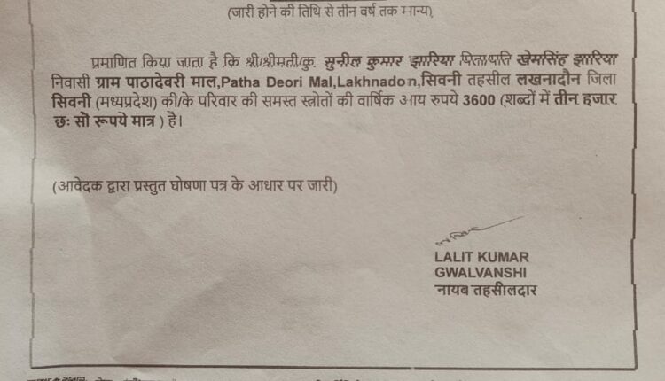 दैनिक रेवांचल टाइम्स सिवनी/ मध्य प्रदेश सरकार ने मध्य प्रदेश के पर्यटन को बढ़ावा देने के लिए एक प्रचार अभियान का नारा लाया था जिसे मध्य प्रदेश के पर्यटन विभाग ने वर्ष 2010 में जारी किया था वो लाइनें हैं एम पी अजब है एम पी गजब हैं जी हां ऐसे ही नारों को अब मध्य प्रदेश सरकार के राजस्व विभाग के द्वारा चरितार्थ किया जा रहा हैं जिसमें धरातली स्तर पर ये लाइनें और नारा हकीकत में देखने और सुनने को मिल रहा हैं। मध्य प्रदेश राजस्व विभाग का सिवनी जिला और इस जिले के अंतर्गत लखनादौन तहसील की उपतहसील धूमा में भूत पूर्व नायब तहसीलदार ललित ग्वालवंशी के द्वारा अजब गजब का कारनामा करते हुए आय प्रमाण पत्र जारी किया गया। जिसमें सुनील कुमार झरिया पिता खेमसिंह झरिया निवासी पाठादेवरी की सालाना आय कुल (3600) ₹ तीन हजार छह सौ रुपए का जारी किया गया। अब सवाल यह बनता हैं कि ऐसे लापरवाह अधिकारियों के द्वारा जारी आय प्रमाण पत्रों ने सरकारी सिस्टम पर भी सवाल खड़े कर दिए हैं। जिससे कि यह जांच का विषय बनता हैं कही ऐसा तो नहीं इनके कार्यकाल में अन्य और व्यक्तियों के आय प्रमाण पत्र के साथ साथ जाति या अन्य दस्तावेजों में गलतियां की गई हो और वास्तव में जिसका लाभ जिसको मिलना चाहिए उसको न मिल कर अन्य किसी और को आर्थिक या अन्य लाभ पहुंचाया गया हो।