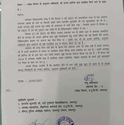 अनुभाग अधिकारी अजय झारिया द्वारा बेवजह कारण बताओ नोटिस जारी किया गया था जिसमे पप्पू अहीरवाल ने अपना सपस्टिकरण दे दिया था जिसमे चिकत्सा प्रमाण पत्र भी लगाया गया था परन्तु उसके बावजूद भी अजय झारिया के द्वारा पुनः नस्ती वापस पप्पू अहीरवाल के पास भेजकर अपने अनुकूल बयान देने का दबाव डाला गया. जिसे लेकर पप्पू अहीरवाल मानसिक रूप से काफ़ी परेशान थे और शुक्रवार 24 मई 2025 को इस आशय कि सुचना पत्र के माध्यम से कुलगुरु और कुलसचिव कार्यालय को दी जिसमे स्पष्ट तौर पर यह उल्लेख किया कि अजय झारिया द्वारा मुझे बेवजह मानसिक रूप से प्रताड़ित किया जा रहा है यदि मुझे कुछ होता है to इसकी समस्त जिम्मेदारी अजय झारिया कि होगी.