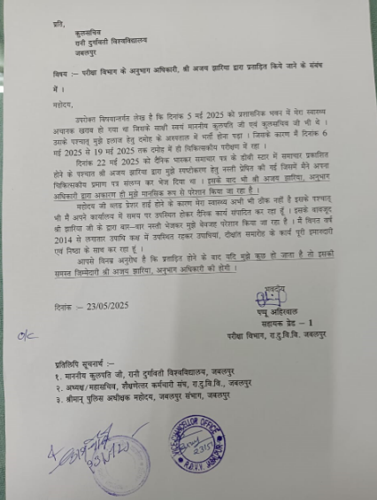 आश्चर्य कि बात यह है कि अजय झारिया द्वारा जो कारण बताओ नोटिस दिया गया उसमे सक्षम अधिकारी के बिना सुचना और बिना जानकारी के दिया गया. जबकि नोटिस जारी करने का अधिकार केवल कुलसचिव जी के द्वारा या उनके आदेश दिए जाने के बाद ही हो सकता है. ज्ञातव्य है कि श्री अजय झारिया द्वारा पूर्व मे भी उक्त कर्मचारी को प्रताड़ित किया जा चुका है जिससे परेशान होकर पप्पू अहीरवाल द्वारा cm हेल्पलाइन मे शिकायत भी दर्ज कराई गई थी. बाद मे विश्वविद्यालय के अधिकारियो के हस्तक्षेप के बाद उसे वापस ले लिया था. इसके पश्चात भी अजय झारिया अनुभाग अधिकारी द्वारा लगातार प्रताड़ित किया जा रहा है जिसकी शिकायत मेरे द्वारा माननीय कुलसचिव / कुलगुरु महोदय को दिनांक 23 मई 2025 को की गई है।