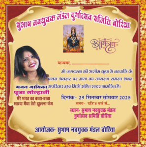 नवरात्रि महोत्सव के अवसर पर सुभाष नवयुवक मंडल दुर्गात्सव समिति, बोरिया द्वारा सोमवार, 29 सितम्बर 2025 को भव्य जागरण एवं भजन संध्या का आयोजन किया जा रहा है। यह आयोजन समिति प्रांगण में रात्रि 8 बजे से प्रारंभ होगा।