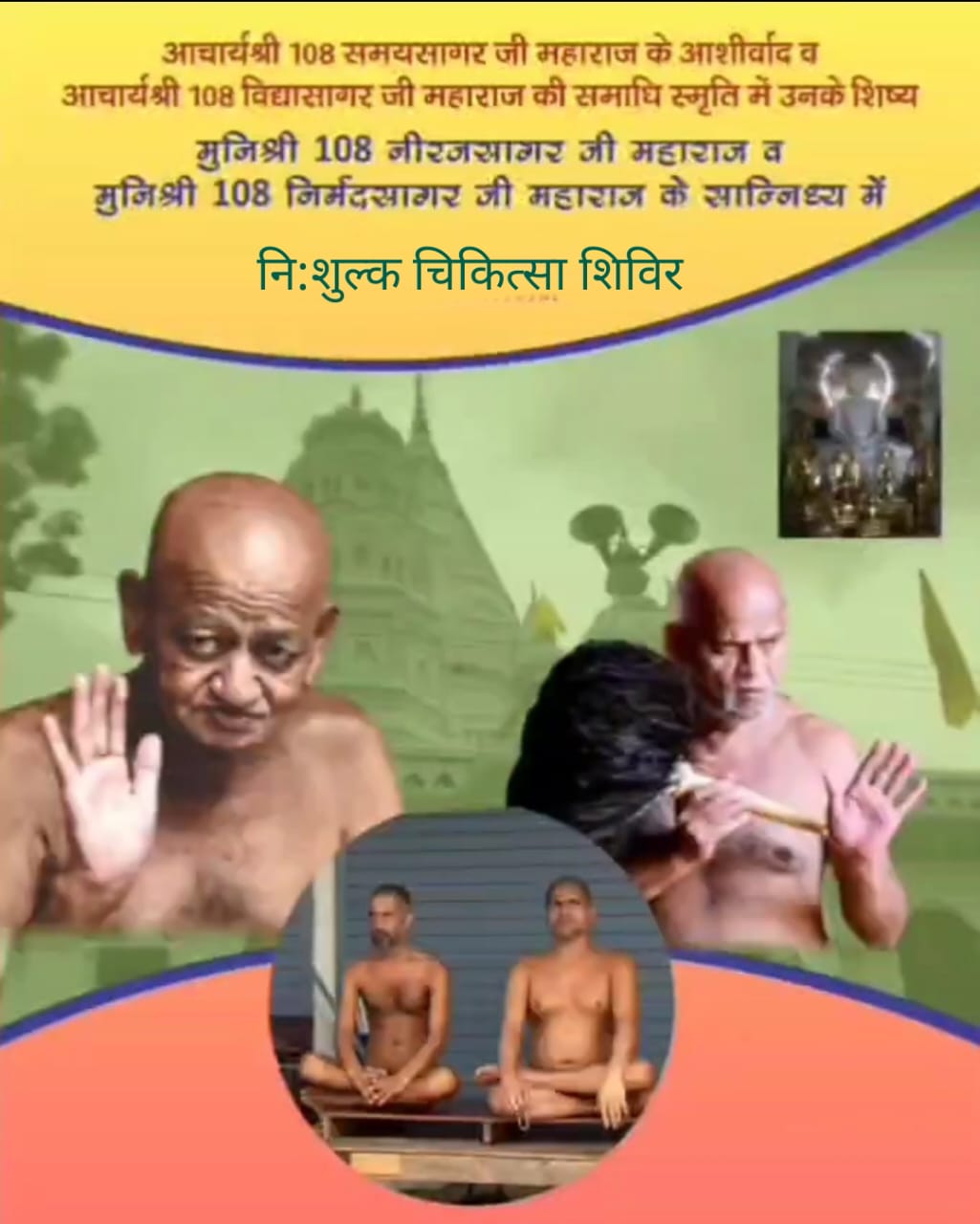 रेवांचल टाईम्स – मंडला चातुर्मास कमेटी एवं श्री विद्यासागर नवयुवक समिति एवं सकल दिगम्बर जैन समाज लघु तीर्थ क्षेत्र व्रती नगरी पिंडरई के संयुक्त तत्त्वाधान में परम पूज्य संत शिरोमणि आचार्य भगवन 108 श्रीविद्यसागरजी महाराज एवं नवाचार्य श्री समय सागर जी महाराज के अवतरण दिवस (शरद पूर्णिमा) के पावन पर्व पर पूज्य मुनि श्री 108 नीरज सागर जी एवं पूज्य मुनि श्री 108 निर्मद सागर जी महाराज के मंगल सानिध्य में श्री विद्या स्वभाव भवन व्रतीनगरी पिण्डरई में दो दिवसीय निःशुल्क चिकित्सा शिविर का आयोजन 4 एवं 5 अक्टूबर को किया जा रहा हैं।ब्र. मनीष भैया, ब्र. आशीष भैया ब्र. सचिन भैया आदि समस्त पूर्णायु के वैद्यों के द्वारा योग, प्राणायाम, औषधि, जड़ीबूटी काढ़ा प्राणिक हीलिंग,पंचकर्म, एक्यूप्रेशर से तुरंत इलाज किया जाएगा। शिविर के संयोजक चौधरी रीतेश जैन एवं श्री हर्ष जैन दीप, मेडिकल ने समस्त जानकरी साधु सेवा समिति के मिडिया प्रभारी ऋषभ जैन को देते हुए उक्त शिविर में समस्त ग्राम एवं जिले वासियों को स्वास्थ्य लाभ हेतु आमंत्रित किया है।
