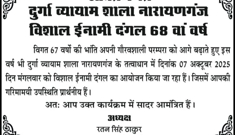 रेवांचल टाइम्स नारायणगंज मंडला परंपरा, शक्ति और खेल भावना का प्रतीक दुर्गा व्यायाम शाला, नारायणगंज द्वारा आयोजित होने वाला वार्षिक 68वां विशाल इनामी दंगल 7 अक्टूबर 2025, मंगलवार को भव्य रूप से आयोजित किया जाएगा। यह आयोजन मंगल भवन ग्राउंड, नारायणगंज मंडला में संपन्न होगा।दंगल की तैयारी जोरों पर है और आयोजन समिति ने कई राज्यों से आने वाले प्रसिद्ध पहलवानों को आमंत्रित किया है। आयोजन समिति के अनुसार इस वर्ष लगभग 100 से अधिक पहलवानों के बीच मुकाबले होंगे। विजेताओं के लिए आकर्षक नकद इनाम और ट्रॉफी की व्यवस्था की गई है।इस बार विशेष पहल के तहत 35 वर्ष पूर्व के वरिष्ठ पहलवानों को मंच पर सम्मानित किया जाएगा, जिन्होंने नारायणगंज की धरती को कुश्ती के क्षेत्र में गौरवान्वित किया है।