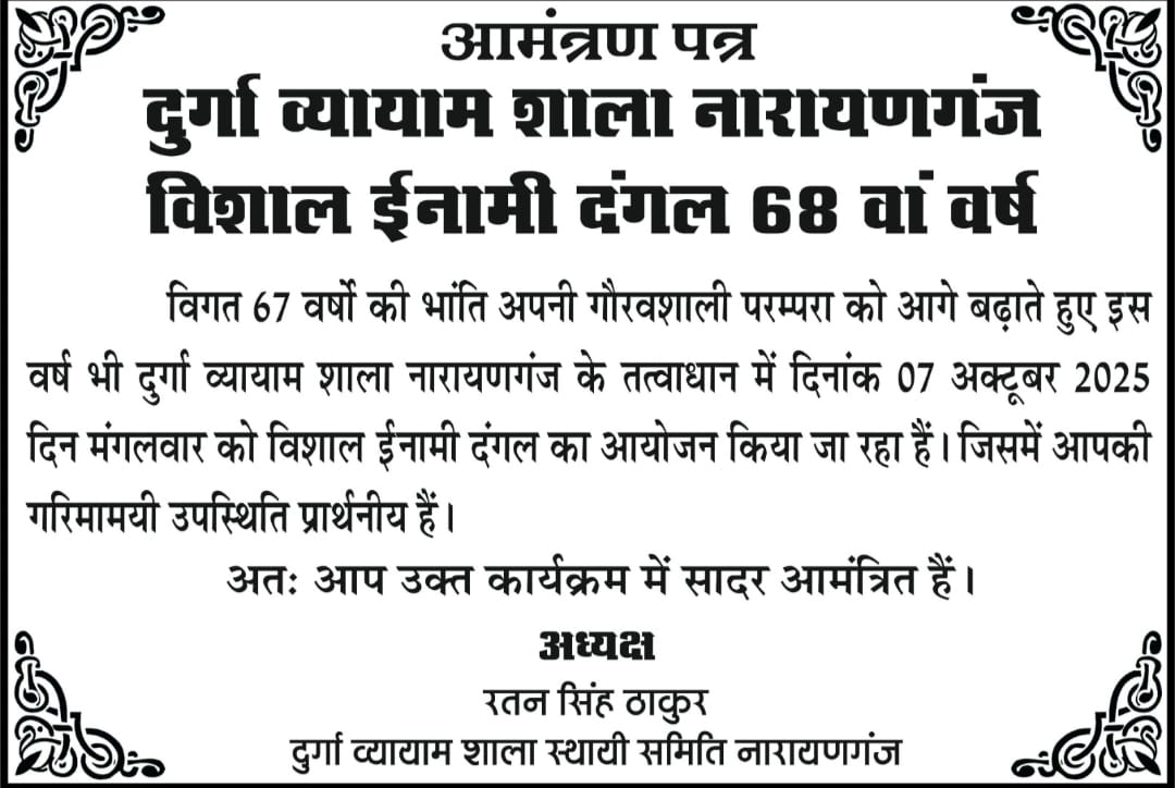 आयोजन समिति ने बताया कि इस वर्ष का दंगल अब तक का सबसे बड़ा और आकर्षक होगा। दर्शकों के बैठने और जलपान की विशेष व्यवस्था की गई है।समिति ने सभी खेल प्रेमियों, ग्रामीणों और युवाओं से अधिक से अधिक संख्या में शामिल होकर इस गौरवशाली परंपरा को सफल बनाने की अपील की है।68 वर्षों से लगातार हो रहा यह आयोजन नारायणगंज की पहचान बन चुका है जहां पहलवानी न सिर्फ खेल है, बल्कि संस्कृति और एकता का प्रतीक भी है।