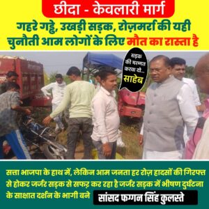 केवलारी मार्ग पर हुए एक भीषण सड़क हादसे के प्रत्यक्षदर्शी स्वयं पूर्व केंद्रीय मंत्री और मंडला सांसद फग्गन सिंह कुलस्ते बने। बताया जाता है कि जब सांसद कुलस्ते अपने काफिले के साथ इस मार्ग से गुजर रहे थे, तभी सामने ही बाइक और ट्रैक्टर के बीच जोरदार टक्कर हो गई। प्रत्यक्षदर्शियों के अनुसार, यह दृश्य देखकर मंत्रीजी ने तुरंत वाहन रुकवाया और घायलों की सहायता के निर्देश दिए। उन्होंने मौके से ही अधिकारियों को फोन कर आवश्यक उपचार और सहायता की व्यवस्था कराई। इसके साथ ही सांसद कुलस्ते ने अपने सोशल मीडिया अकाउंट पर पीड़ितों के प्रति संवेदना व्यक्त करते हुए शीघ्र स्वस्थ होने की कामना की | स्थानीय लोगों ने सांसद के त्वरित कदम की सराहना की है, लेकिन साथ ही यह सवाल भी उठाया है कि —“क्या इस घटना के बाद आखिरकार इस जर्जर और गड्ढों से भरी सड़क की मरम्मत होगी, या फिर यह मुद्दा भी केवल सोशल मीडिया तक सीमित रह जाएगा?” छिंदा–केवलारी मार्ग लंबे समय से खराब स्थिति में है, जिससे आए दिन दुर्घटनाएँ घट रही हैं। आम जनता अब प्रशासन से इस मार्ग की शीघ्र मरम्मत और सुरक्षा उपायों की मांग कर रही है।