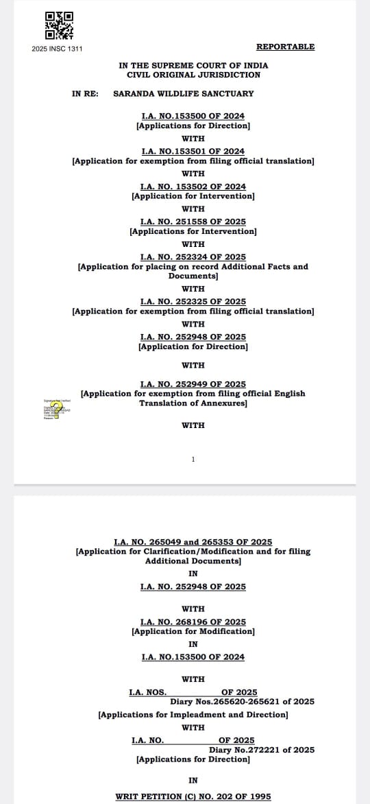रेवांचल टाईम्स – बीते गुरुवार को सुप्रीम कोर्ट के मुख्य न्यायाधीश बी.आर.गवई और न्यायमूर्ति के.विनोद चंद्रण की खंडपीठ ने झारखंड सरकार को निर्देश दिया है कि 1968 की अधिसूचना में बताए गए 126 वन खंडों वाले कुछ कम्पार्टमेंट क्षेत्र को छोड़कर तीन महीने के भीतर वन्यजीव अभयारण्य घोषित किया जाए। राष्ट्रीय उद्यान या वन्यजीव अभयारण्य के भीतर तथा उसकी सीमा से एक किलोमीटर के दायरे में खनन पूर्णतः निषिद्ध रहेगा। राज्य सरकार यह व्यापक रूप से प्रचारित करे कि इस निर्णय से आदिवासियों या वनवासियों के व्यक्तिगत और सामुदायिक अधिकार प्रभावित नहीं होंगे। वनाधिकार अधिनियम, 2006 की धारा 3 और 4(1) के अंतर्गत उनके अधिकार सुरक्षित रहेंगे। यह मामला झारखंड के सरंडा वन क्षेत्र से जुड़ा है, जो देश के सबसे सुंदर और घने साल के जंगलों में से एक है। वर्ष 1968 की अधिसूचना द्वारा 31,468.25 हेक्टेयर क्षेत्र (लगभग 314 वर्ग किलोमीटर) को “सरंडा गेम सेंक्चुरी” घोषित किया गया था। वर्षों से यहां खनन गतिविधियों के कारण पर्यावरणीय और वन्यजीव हानि की शिकायतें उठती रहीं।
