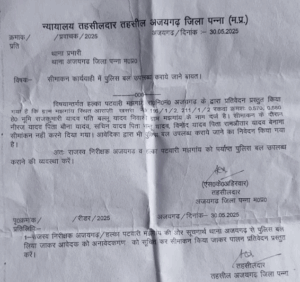 प्राप्त सरकारी पत्र (क्रमांक / प्रावक / 2025 दिनांक 30.05.2025) के अनुसार, तहसील अजयगढ़ द्वारा थाना प्रभारी को निर्देशित किया गया कि विवादित भूमि का सीमांकन पुलिस बल की उपस्थिति में कराया जाए। आदेश में साफ लिखा गया है कि:
