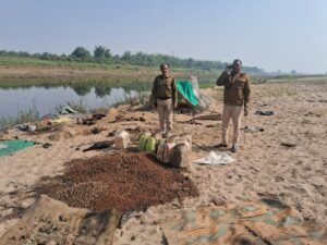 रेवांचल टाइम्स मंडला दिनांक 21/11/2025 को *कलेक्टर सोमेश मिश्रा मण्डला के निर्देशन मे जिला आबकारी अधिकारी रामजी पांडेय के मार्गदर्शन में मण्डला जिले में मदिरा के अवैध संग्रहण,परिवहन एवं विक्रय के विरुद्ध की गई कार्यवाही में कारिकोंन,महाराजपुर,मानादेही क्षेत्र में दबिश की कार्यवाही की गई।जिसमें मानादेही में नर्मदा नदी के किनारे मदिरा निर्माण एवम विक्रय करने वाले अड्डो पर आबकारी दबिश की कार्यवाही में कुल 03 अड्डो से 130 डिब्बे महुआ लाहन के बरामद किए जिसमे लगभग 1300 किलो महुआ लाहन भरा पाया।जिसकी अनुमानित कीमत 1,30,000/-है।जप्त लाहन को घटनास्थल पर नष्ट किया गया। 75 लीटर हाथ भट्टी कच्ची मदिरा बरामद किया जिसकी अनुमानित कीमत 11250/-है।कारिकोंन में मदिरा विक्रय करने वाले व्यक्तियों के विरुद्ध 03 प्रकरण पंजिबद्ध किया।जिसमें 20 लीटर कच्ची मदिरा 18 प्लेन मदिरा को जप्त किया गया। प्रकरण में ज्ञात/अज्ञात आरोपियो के विरुद्ध मध्यप्रदेश आबकारी अधिनियम के अंतर्गत धारा 34(1) का पंजीबद्ध किया गया ।जप्त मदिरा एवं लाहन की कुल अनुमानित कीमत 145750/ है ।उक्त कार्यवाही के दौरान आबकारी उपनिरीक्षक सर्वेश नागवंशी,शैली सैयाम,प्रधान आरक्षक भानु पुसाम, दुर्जन कुलेश,शकुंतला सैयाम,प्रिया नायडू,विजय कमलेश,सत्यपाल मरावी,रघुनाथ उइके,कन्हैया ,महेश पटेल उपस्थित उपस्थित रहे।