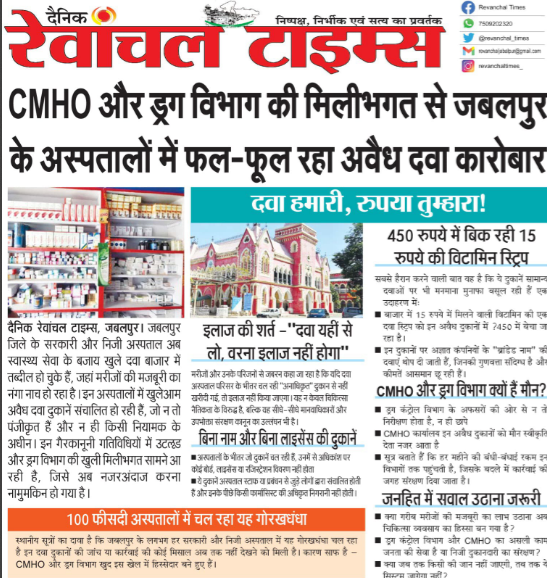 रेवांचल टाइम्स जबलपुर|जबलपुर जिले के सरकारी और निजी अस्पताल अब स्वास्थ्य सेवा के बजाय खुले दवा बाजार में तब्दील हो चुके हैं, जहां मरीजों की मजबूरी का नंगा नाच हो रहा है। इन अस्पतालों में खुलेआम अवैध दवा दुकानें संचालित हो रही हैं, जो न तो पंजीकृत हैं और न ही किसी नियामक के अधीन। इन गैरकानूनी गतिविधियों में CMHO और ड्रग विभाग की खुली मिलीभगत सामने आ रही है, जिसे अब नजरअंदाज करना नामुमकिन हो गया है।
