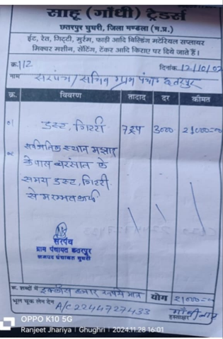 पंचायत राज अधिनियम में स्पष्ट रूप से लेख है कि कोई भी जनप्रतिनिधि किसी भी प्रकार से शासकीय योजना का लाभ और उसके अंतर्गत किसी भी प्रकार से ठेकेदारी नहीं कर सकता लेकिन ग्राम पंचायत छतरपुर के उपसरपंच के के बेटे के द्वारा मटेरियल सप्लायर के नाम से लाखों रुपयों का लेने-देन किया गया है जो कि गलत है फिर भी शासकीय पोर्टल में साफ दिखाई देने के बाद भी आज तक कोई कार्रवाई नहीं की गई है