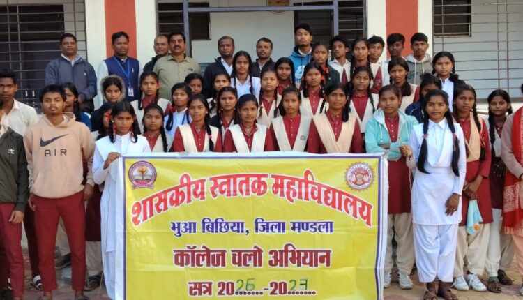 रेवांचल टाइम्स – मंडला, मध्य प्रदेश उच्च शिक्षा विभाग मध्य प्रदेश शासन के निर्देशानुसार प्राचार्य रोहिणी कुमार कोस्टा के मार्गदर्शन में कॉलेज चलो अभियान के अंतर्गत शैक्षणिक सत्र 2026- 27 के लिए शासकीय स्नातक महाविद्यालय भुआ बिछिया की टीम शासकीय हायर सेकेंडरी स्कूल दानी टोला, शासकीय हायर सेकेंडरी स्कूल खजूरी में जाकर कक्षा 12वीं में अध्यनरत छात्र- छात्राओं को प्रवेश प्रक्रिया, राष्ट्रीय शिक्षा नीति, पाठ्यक्रम छात्र कल्याण योजनाओं की जानकारी एवं महाविद्यालयीन आधारभूत संरचना एवं उपलब्ध सुविधाओं से सहज ,सरल भाषा में पीपीटी के माध्यम से विस्तार पूर्वक जानकारी दी गई।विद्यालय में उपस्थित विद्यार्थियों ने अपनी जिज्ञासाओं तथा शंकाओं का समाधान कॉलेज चलो अभियान दल से प्राप्त किये। अभियान दल कक्षा 12वीं में अध्यनरत समस्त विद्यार्थियों को शत- प्रतिशत उच्च शिक्षा अध्ययन हेतु प्रेरित किया।